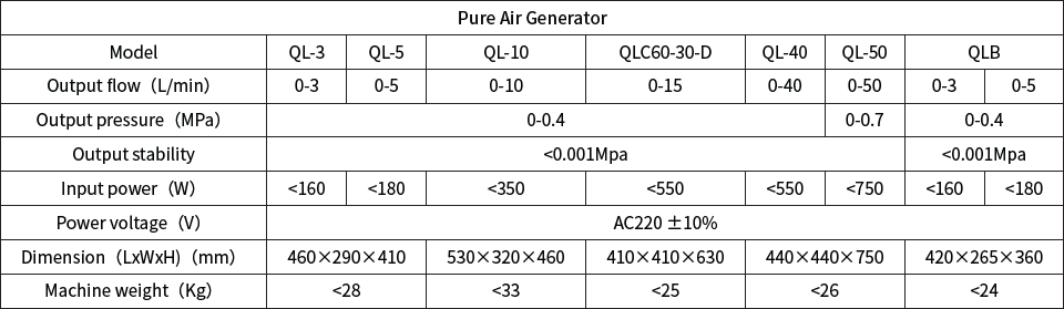Using a fully sealed mute compressor as the power, the natural air is purified to remove moisture, oil and impurities. The stable and clean